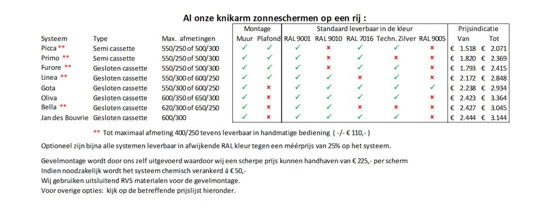 Hieronder kunt u per knikarmscherm onze prijslijst downloaden (update 9 februari 2025)